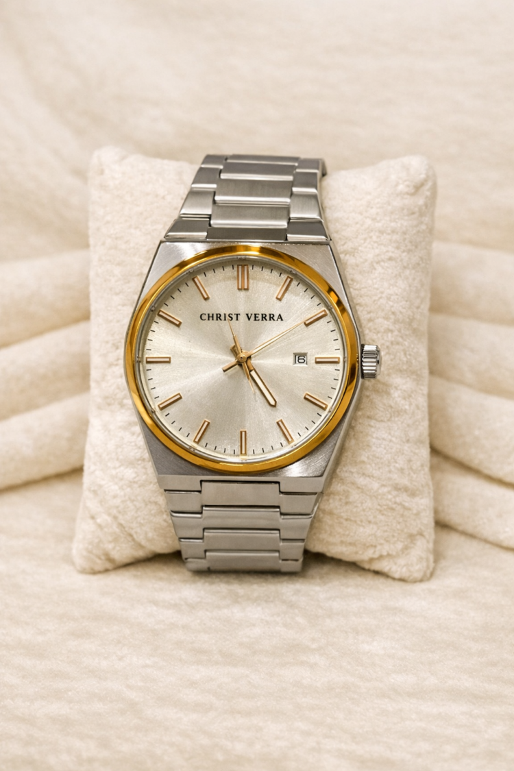 jam ini menonjolkan estetika bersih yang cocok untuk acara formal maupun gaya kasual harian. Dilengkapi dengan strap mesh stainless steel yang bisa diatur ukurannya dengan mudah tanpa perlu alat tambahan
